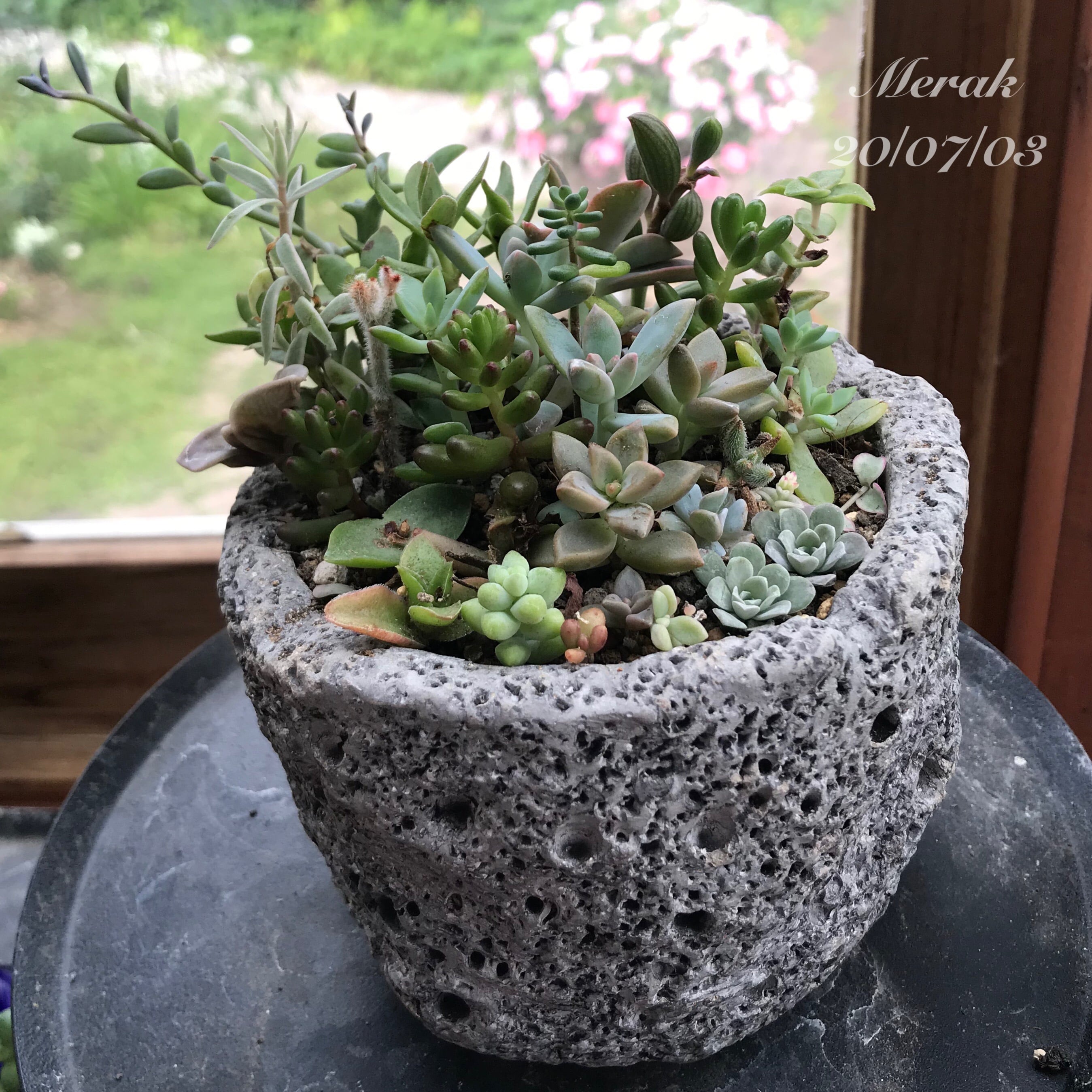 ゴツゴツしたコンクリート鉢に、色々な多肉植物を植えました。