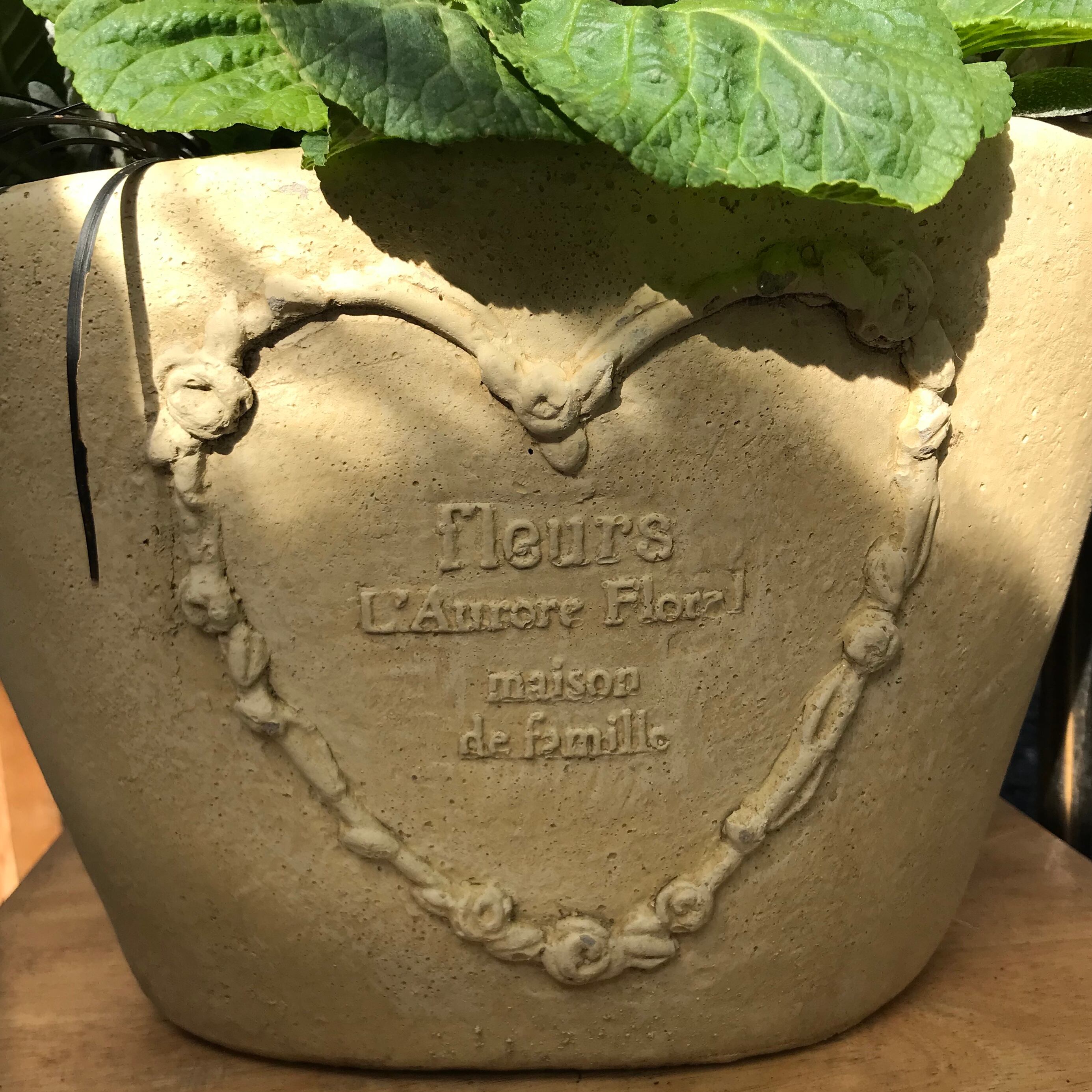 ハート模様が可愛い楕円形の鉢に、綺麗なピンク色のジュリアン イチゴのミルフィーユを寄せ植えしました。
