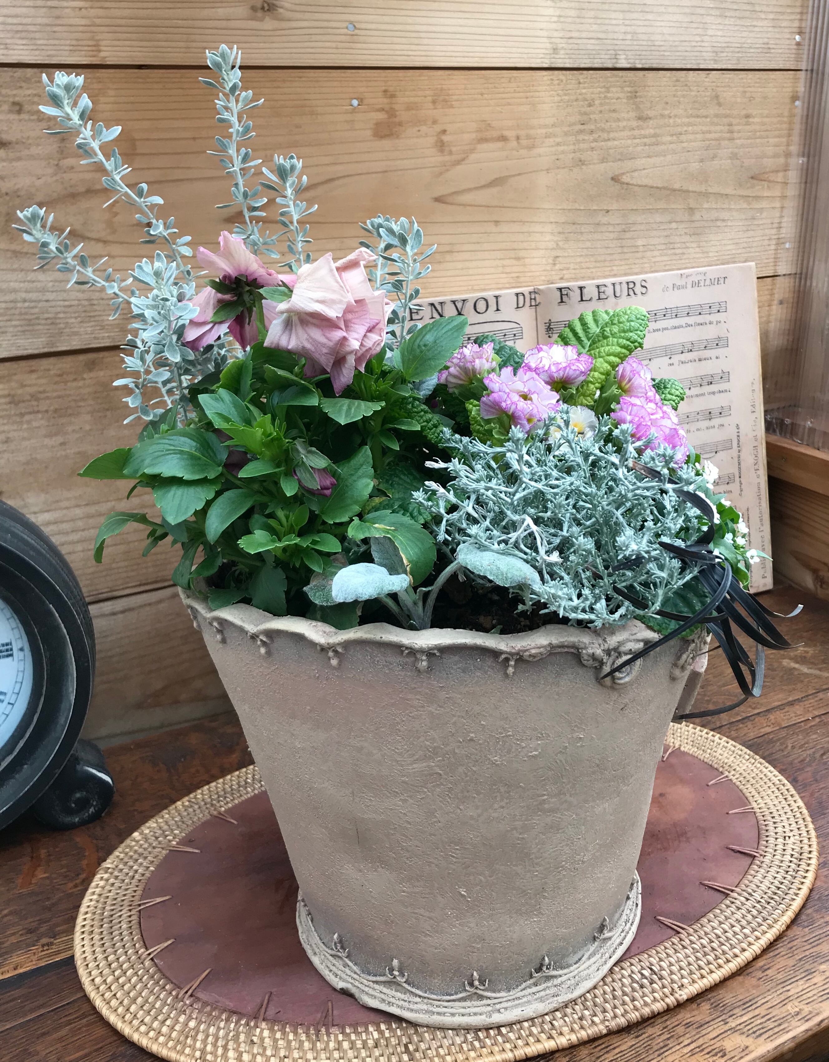 グラスファイバー製の可愛い鉢に、パープル系ピンクのお花とシルバーリーフを合わせ、少しのお世話をすれば初夏まで楽しめる寄せ植えにしました。