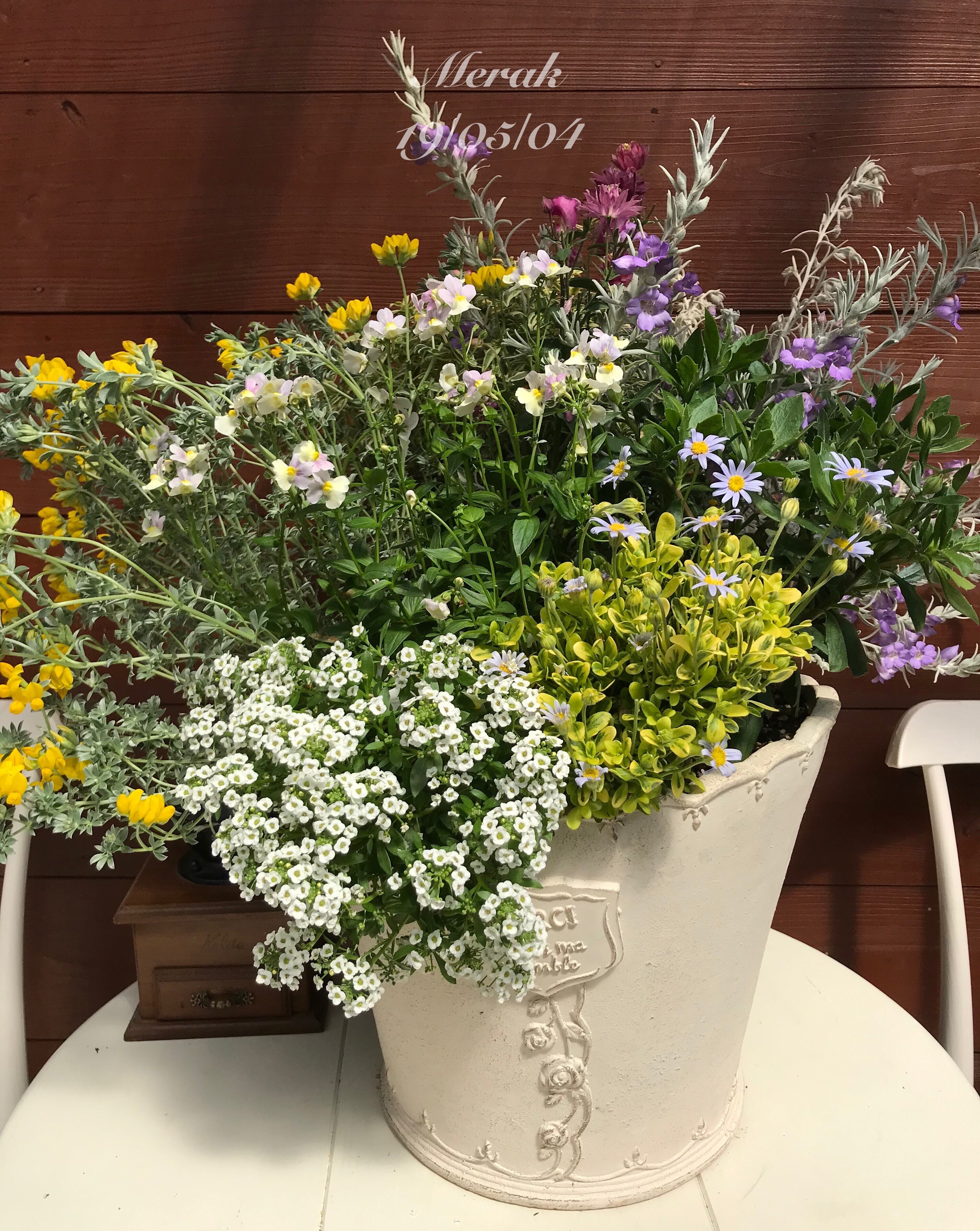 グラスファイバーの素敵な鉢に、パステルカラーのお花たちを植えました。