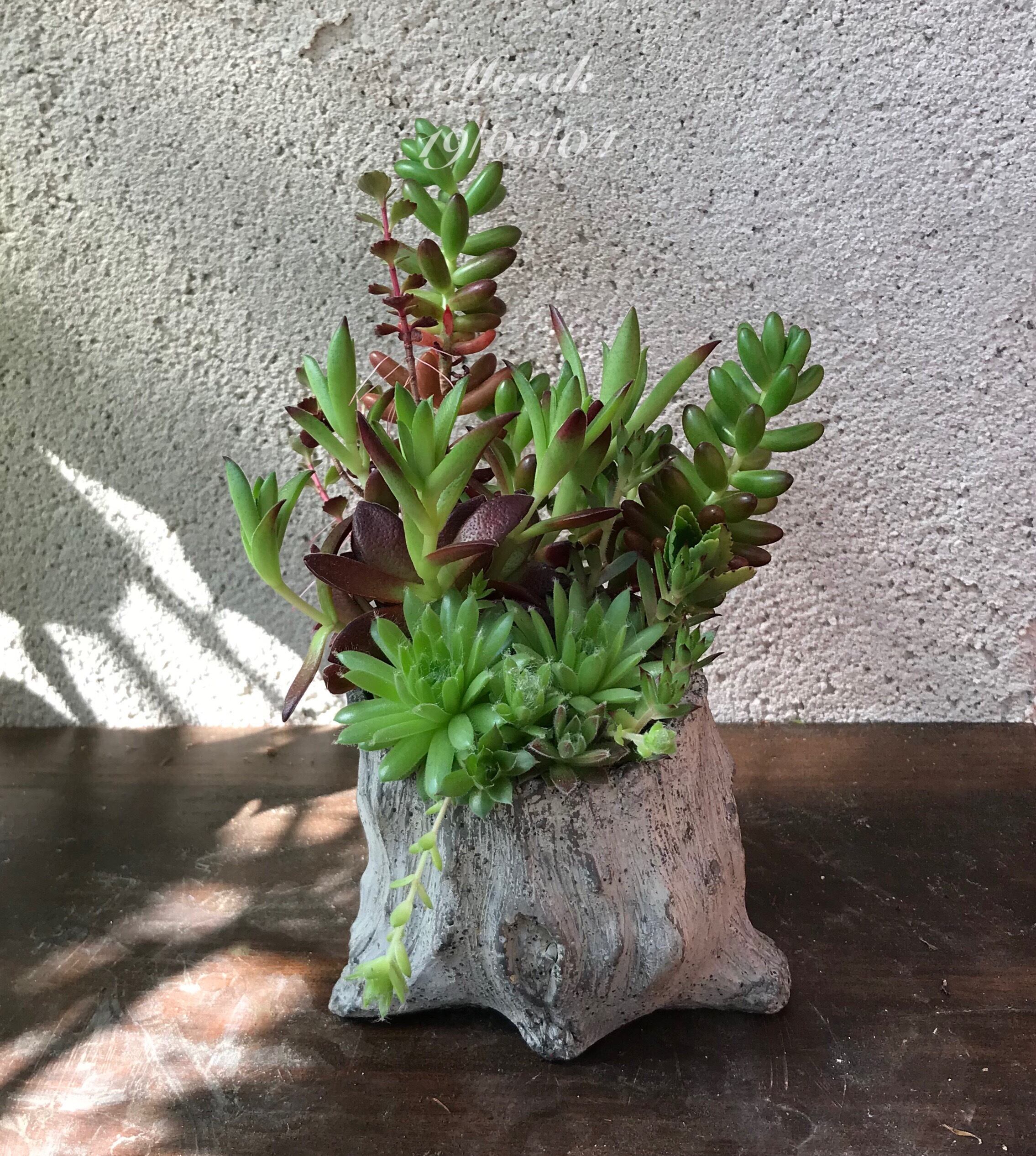 切り株風のポットに色々な多肉植物を植えました。 ✳︎鉢✳︎ 100㎜×100㎜