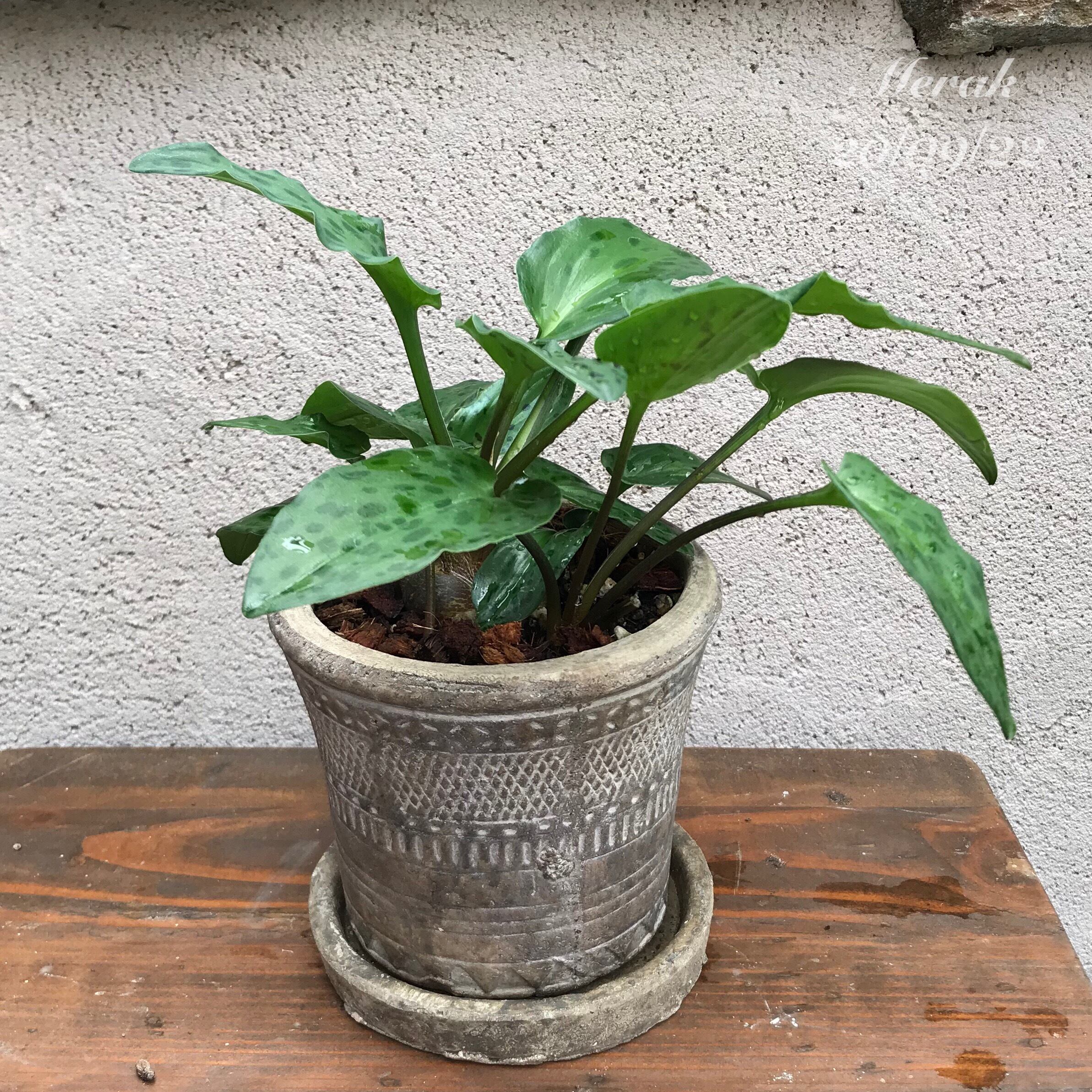 葉っぱのアニマル柄が何とも特徴的なドリミオプシスを、近頃人気のアフリカンテイストなポットに植えました。