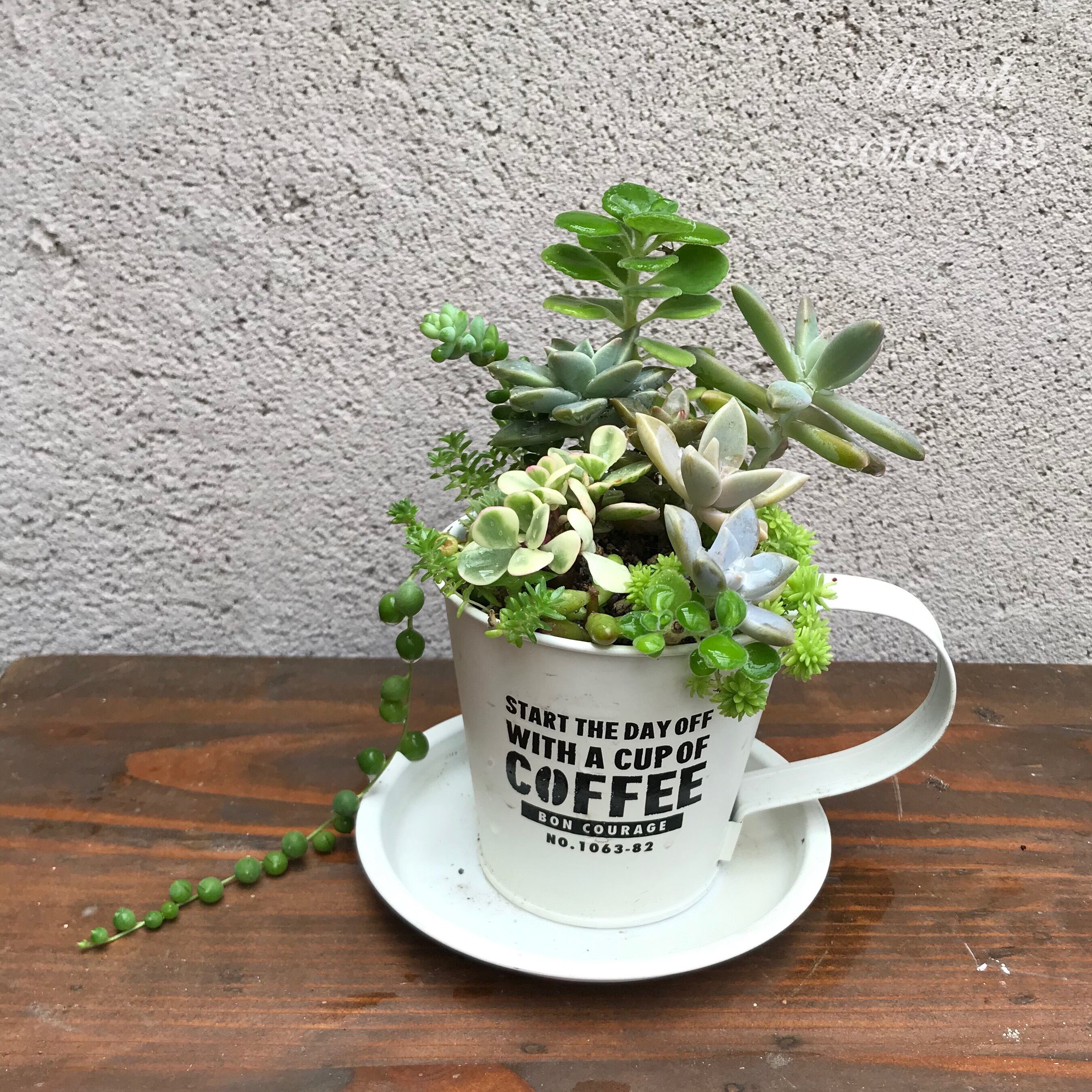 コーヒーカップ型のブリキポットに多肉植物を寄せ植えしました。