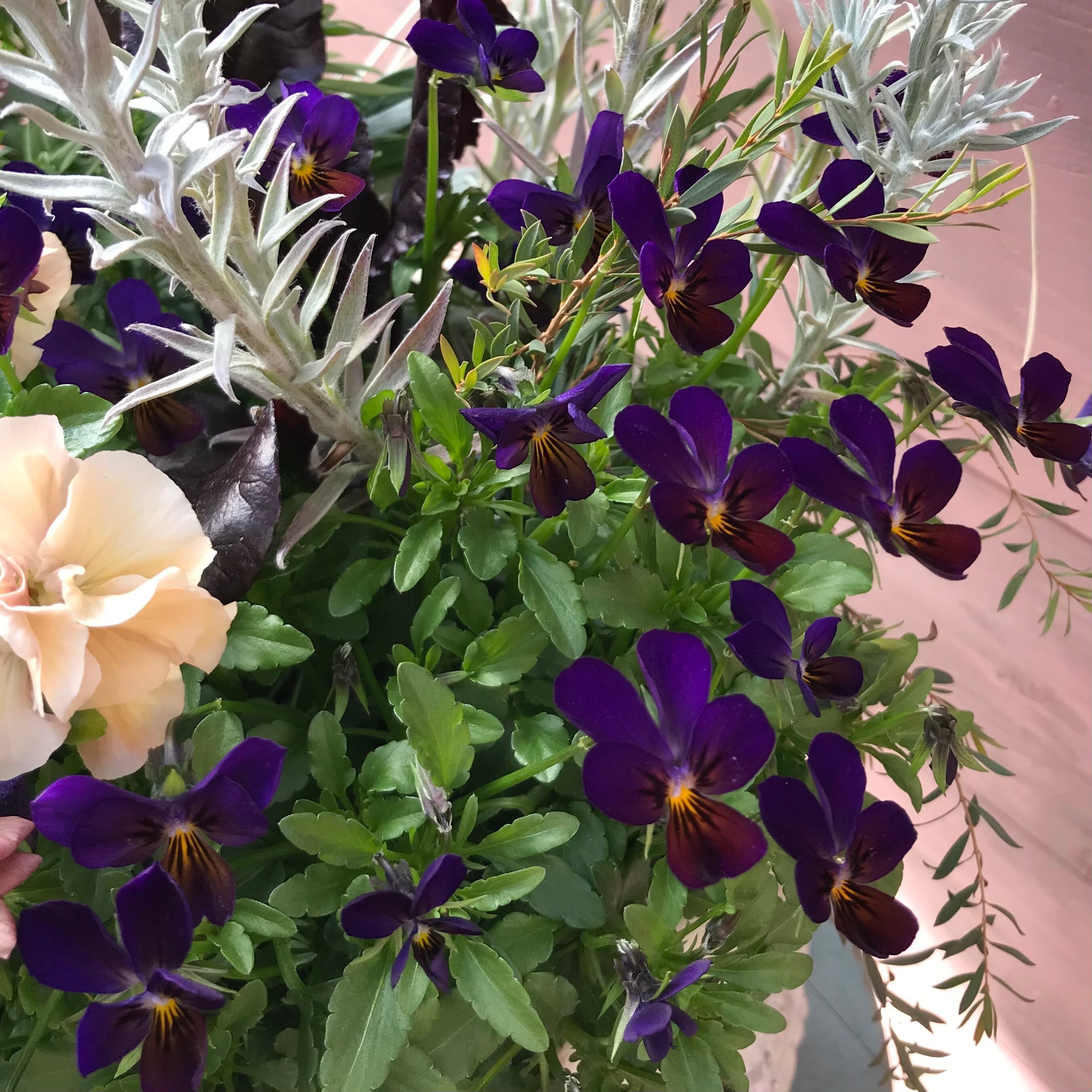 お花が散りばめられたアンティーク風の素敵な鉢に、パステルカラーのお花たちを植えました。