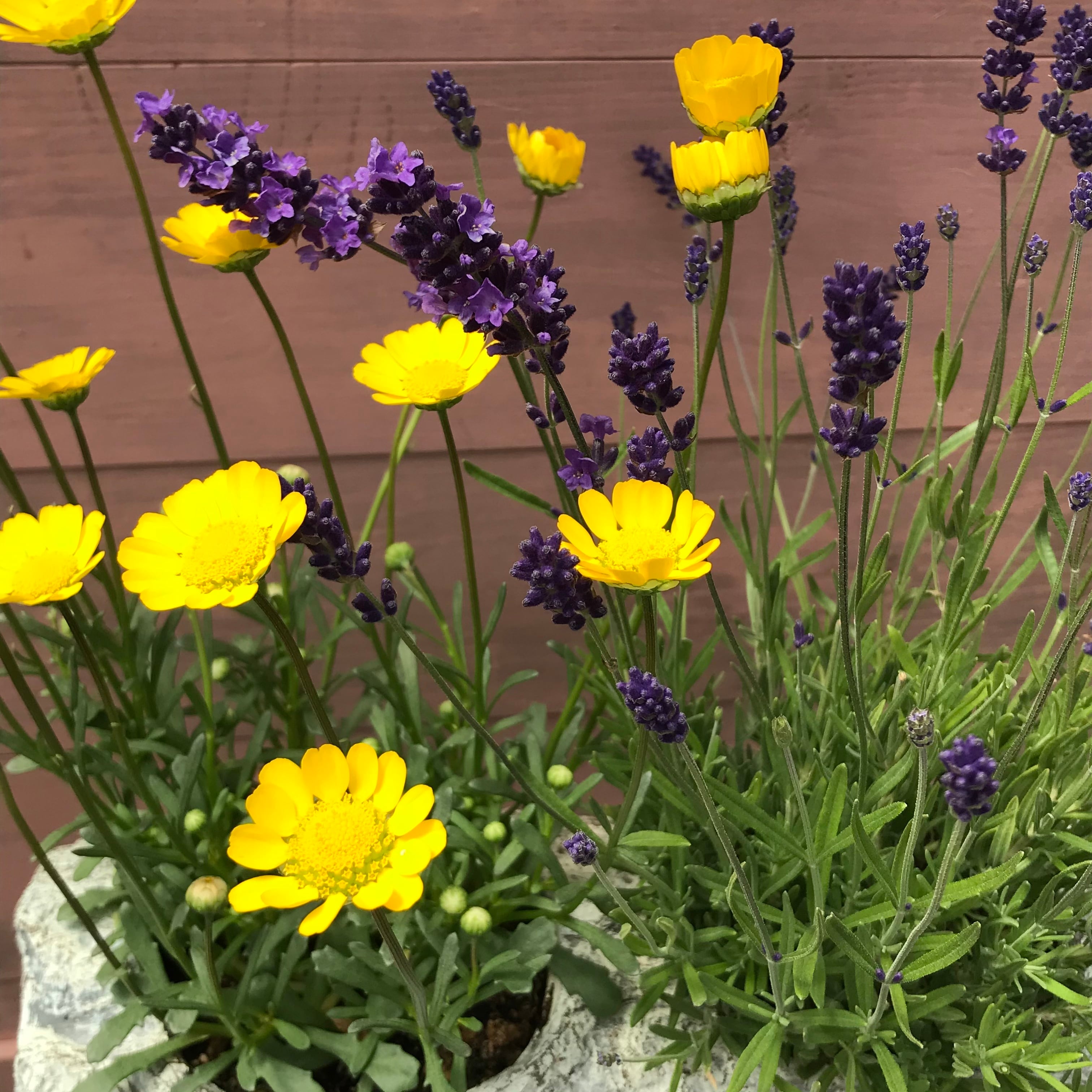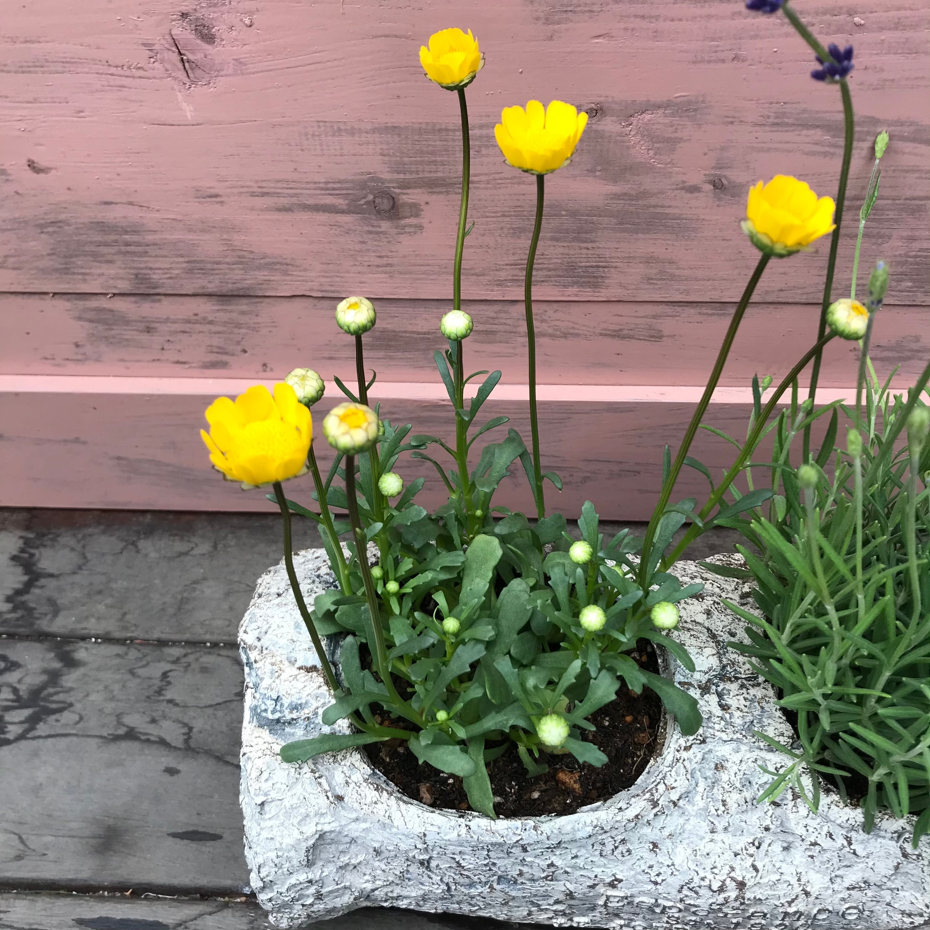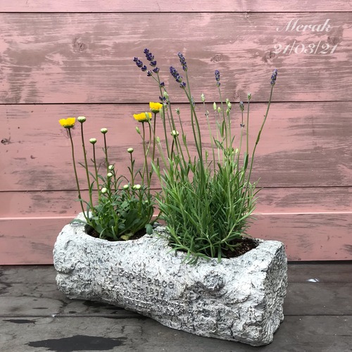 丸太風のグラスファイバーポットで寄せ植えを作りました。